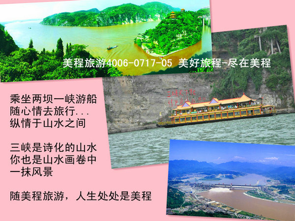 【两坝一峡游船一日游散客接待友情提示 】 :1、亲爱的游客朋友们,美程旅游(4006-0717-05)欢迎您!当您第一次给我们打电话预定或者通过网站在线订单、QQ、手机短信等方式确认您的出行游览计划的时候,恭喜您的美程之旅开始了!
