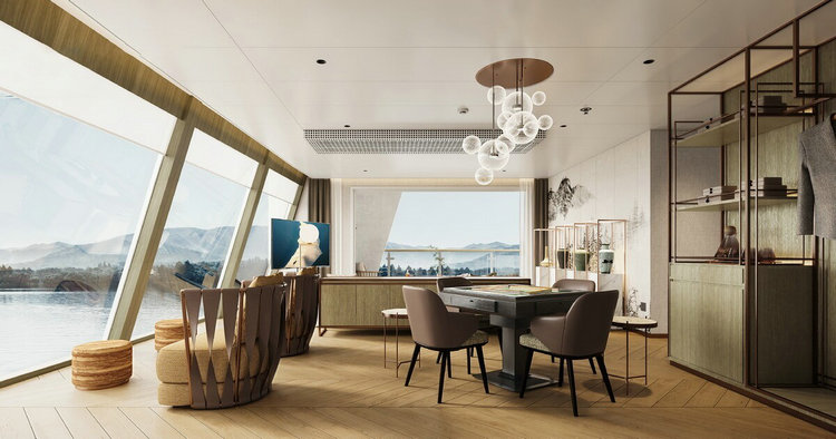 内部船头船尾及双层楼梯空间的天花板,均采用玻璃方式,增加船内通透感和明亮度,拉近人与自然的距离,身临其境于峡谷山水之间。揽江阁观景区域占全船面积的80%,超出载客人数50%的休息位,满足游客自由落座,任意享受不同空间带来的观赏体验。江山如诗游轮另外配有16间包房,开创全景斜角阳台,同时带有独立卫生间及麻将机,一边纵情玩乐,一边私享绝美风光。