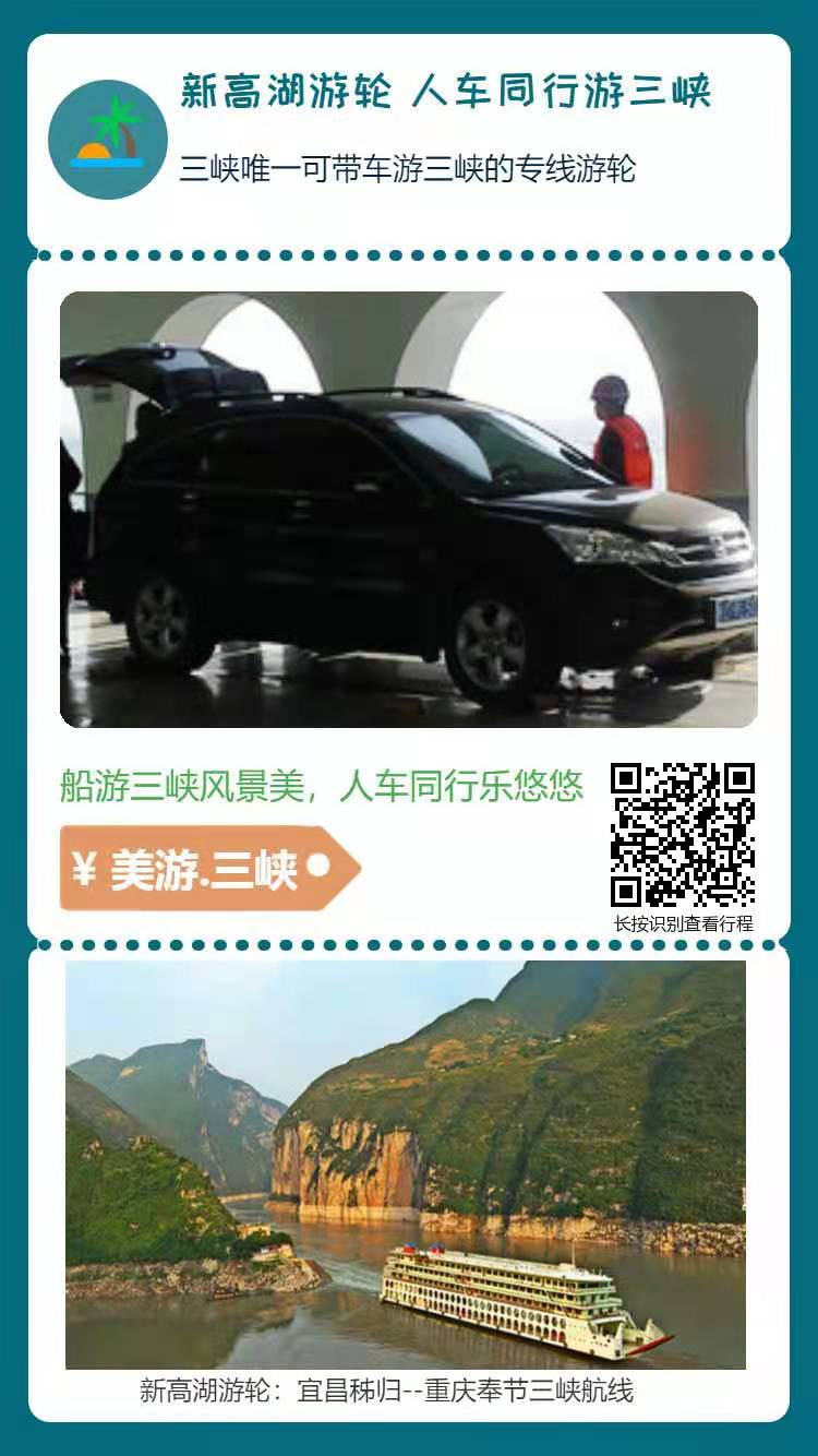 1、长江三峡水上旅游方式的创举:实现「人车同游」,汽车乘船也能游览长江三峡;新高湖游轮开创〖人车同游三峡〗的新时代;