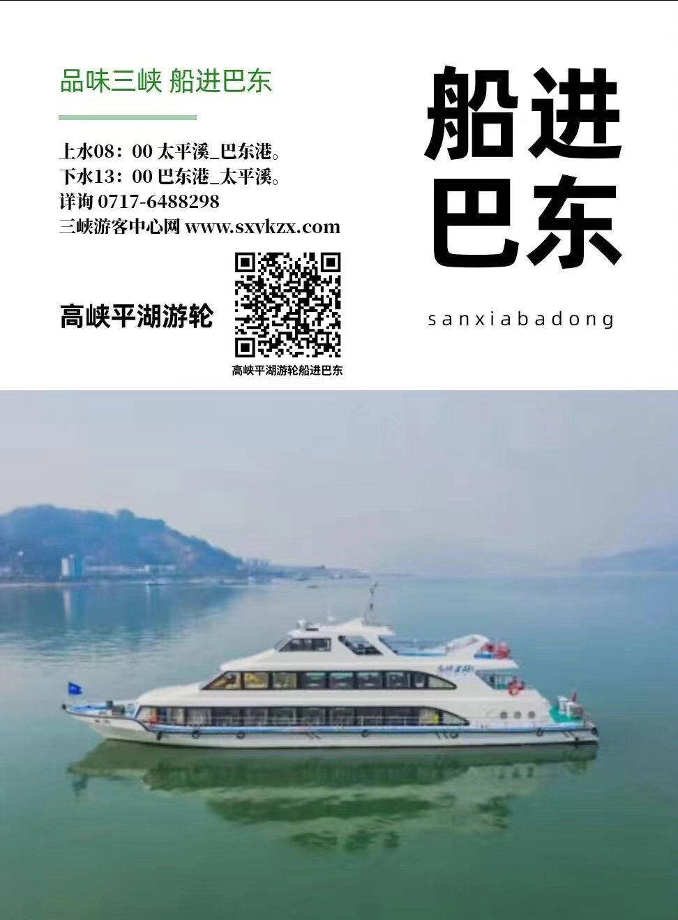 <品位三峡船进巴东>高峡平湖游轮巴东带宜昌太平溪船票预订(下水),本价格为成人价格(儿童身高超1.2米船票同成人),13点巴东港开船,经过西陵峡,约17点抵达太平溪港 。高峡平湖游轮准确班次请咨询客服确认 0717-6488298.